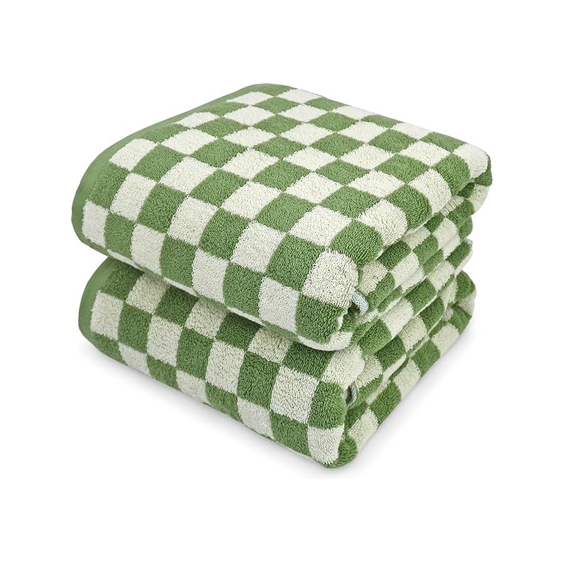 Jacquotha Bath Towels Set of 2 - Luxury Cotton Bathroom Shower Towels Body 55” x 27.5” Absorbent, Quick Dry, 520GSM, Green Checkered Home Decor