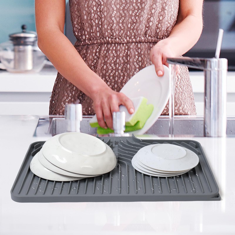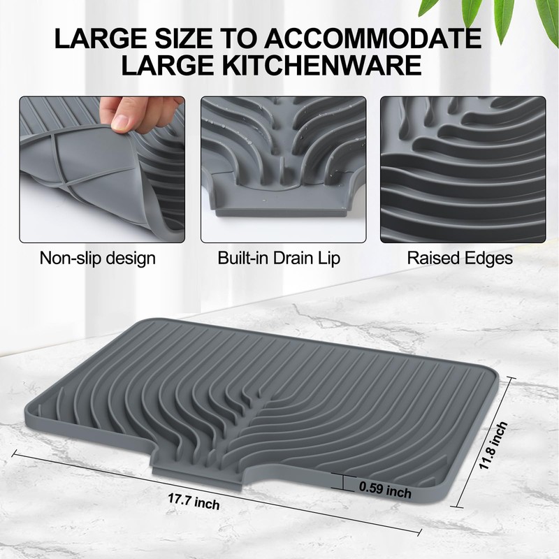 - Quick Drying Design: Measuring 17.7"L x 11.8"W x 0.59"H, the dish drying mat has an innovative raised design that allows air circulation beneath dishes for faster drying. Unique diagonal ridges help remove excess moisture, while the specially designed drain lip water directly into the sink to keep countertops dry.