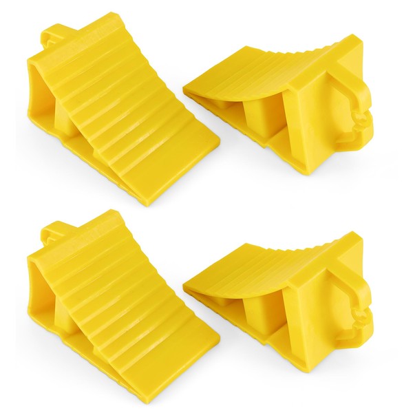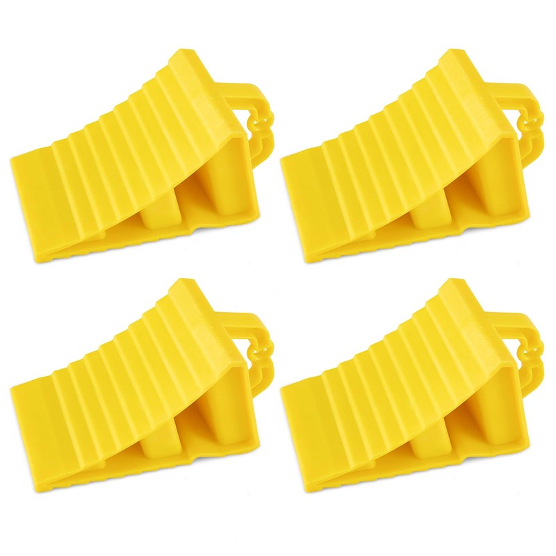 - [Enhanced Traction with Bright Yellow Color]: The vivid yellow hue of these wheel chocks for rv trailer ensures visibility in low-light conditions, making them easy to spot and use. Equipped with a convenient rope for handling, the simple design supports easy carry as wheel stopper or rv tire chocks without added hassle