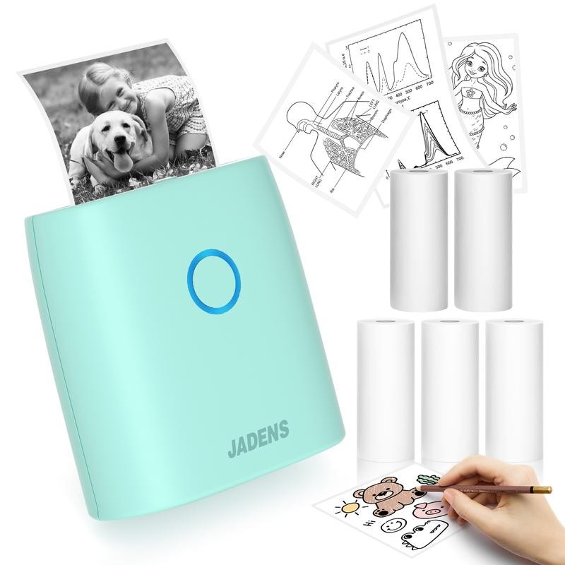 JADENS Mini Sticker Printer-2 Inch Bluetooth Thermal Pocket Printer,Inkless Portable Printer for Study Notes,Photos, Memos,Lists,Gifts,Journals:_1 Printer (Green)+5 Roll label