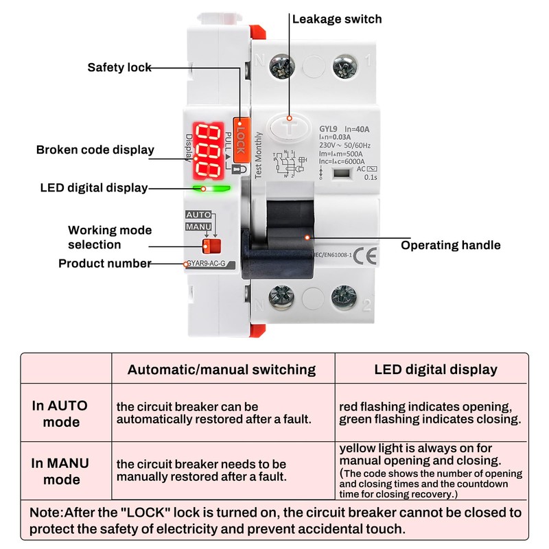 - 【Automatic/Manual Switching】: When the auto reset switch is in auto mode, it can automatically close again after an error. In MANU mode, it must be manually restored after the error. Once the lock of the Type A Fi circuit breaker is opened, closing is no longer possible. This ensures electrical safety and prevents accidental contact.