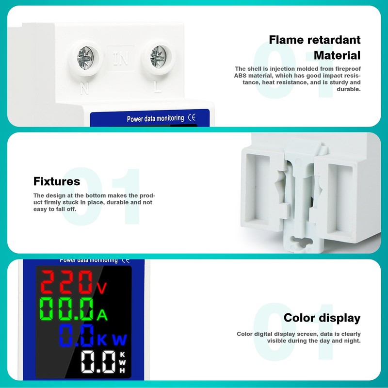 - 【Color Screen】: The electricity meter has a digital color screen and can intuitively display four types of data: voltage, current, electrical energy and power. The data is clearly visible during the day and at night.