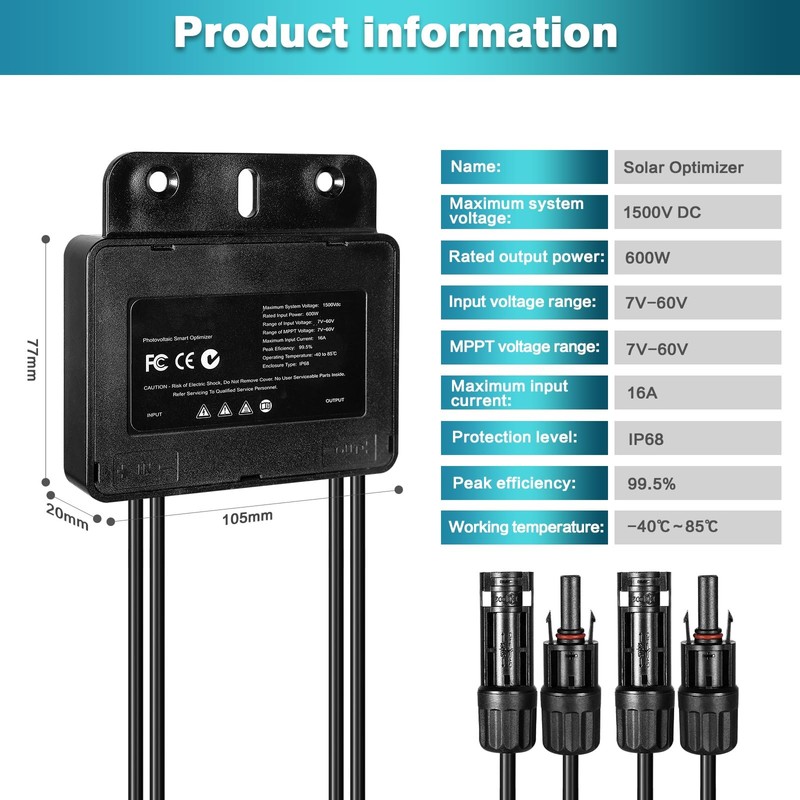 - 【Good power monitoring】Rated output power: 600W; Input voltage range: 7V-60V. The solar panel optimiser can monitor the operating status of each photovoltaic module in real time, identify and accurately locate problematic components.