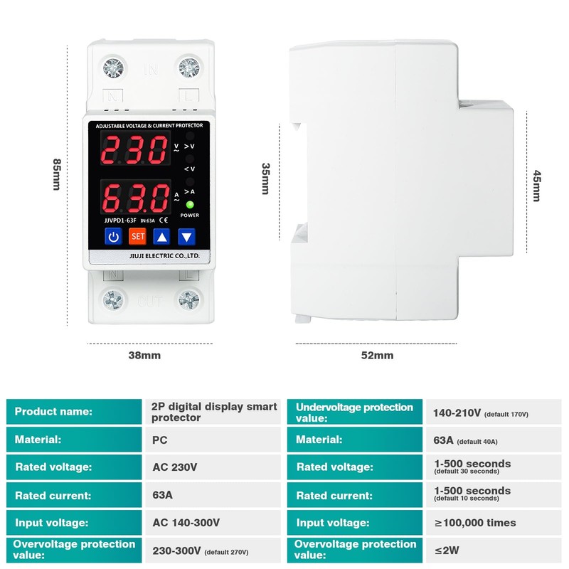 Jadeshay Surge Protection and Undervoltage Protection, 2P 63A 230V Dual Display Adjustable Over-Under Voltage Protection Device Overcurrent Protection Device DIN Rails Surge Protection DIN Rail
