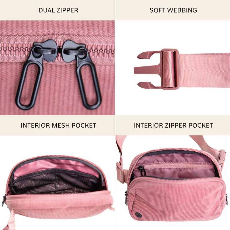 Jadyn Belt Bag, Casual Crossbody and Belt Fanny Pack for Women and Men, Adjustable Strap, Multiple Pockets, Durable Material (Pink Corduroy)