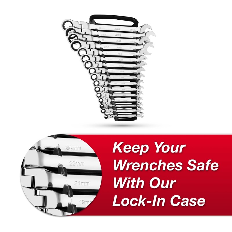 Jaeger 16pc MM/Metric Flex Head TIGHTSPOT Ratcheting Combination Wrench Set With Lock-In Rack - Metric Flexhead MASTER SET With Flexible Ratchet Speed Wrenches And A Lock-In Rack Case