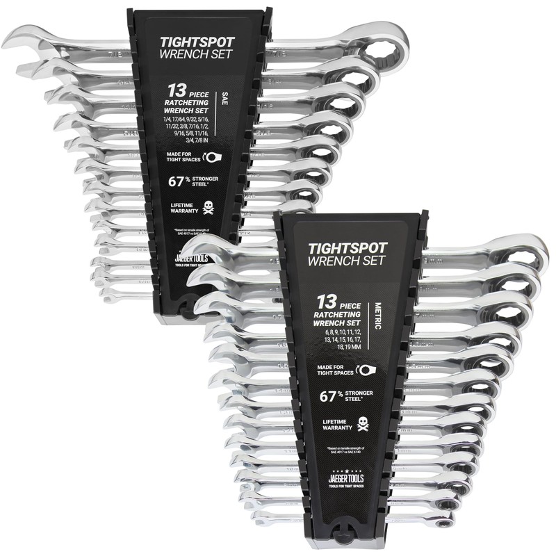 Jaeger 26pc IN/MM TIGHTSPOT Ratcheting Wrench Set - MASTER SET With Inch & Metric Ratchet Speed Wrenches And A Quick Access Wrench Organizer - Our standard in combination wrench sets from gear to tip