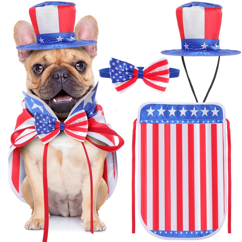 - Abundant in Quantity: never be short on patriotic pet accessories with our kit that includes a vibrant American flag bow tie, a white, blue and red striped pet dog and cat hat, and a dog American flag cape; Our range of items are designed for small to medium sized dogs or cats, and the cape comes in different sizes to ensure your furry friend fits perfectly