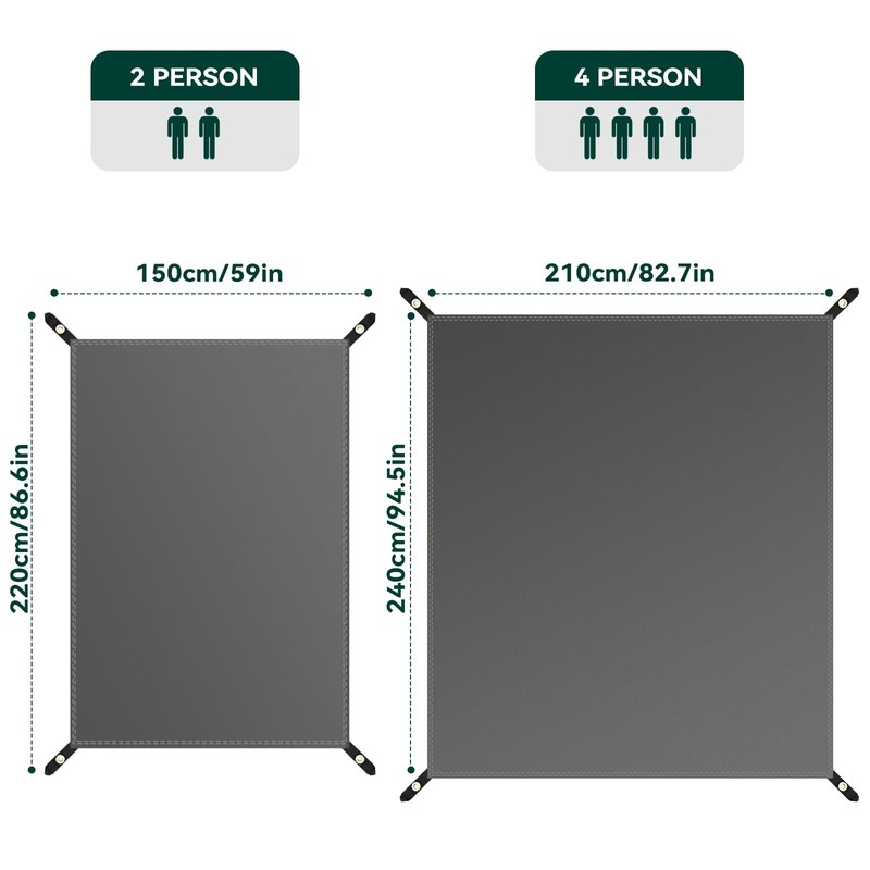 - ULTRA-LIGHT AND PORTABLE: Our tent mats are available in a variety of sizes, 86" x 59" and 94" x 82", which can be perfectly matched with 2-person and 4-person tents, 2-person mats are packed with 11" x 5.5" x 2.4" and weigh only 0.69 lbs, 4-person mats are packed with 11.4" x 6.3" x 2.7" and weigh only 1.0 lbs, which can be very easy to carry