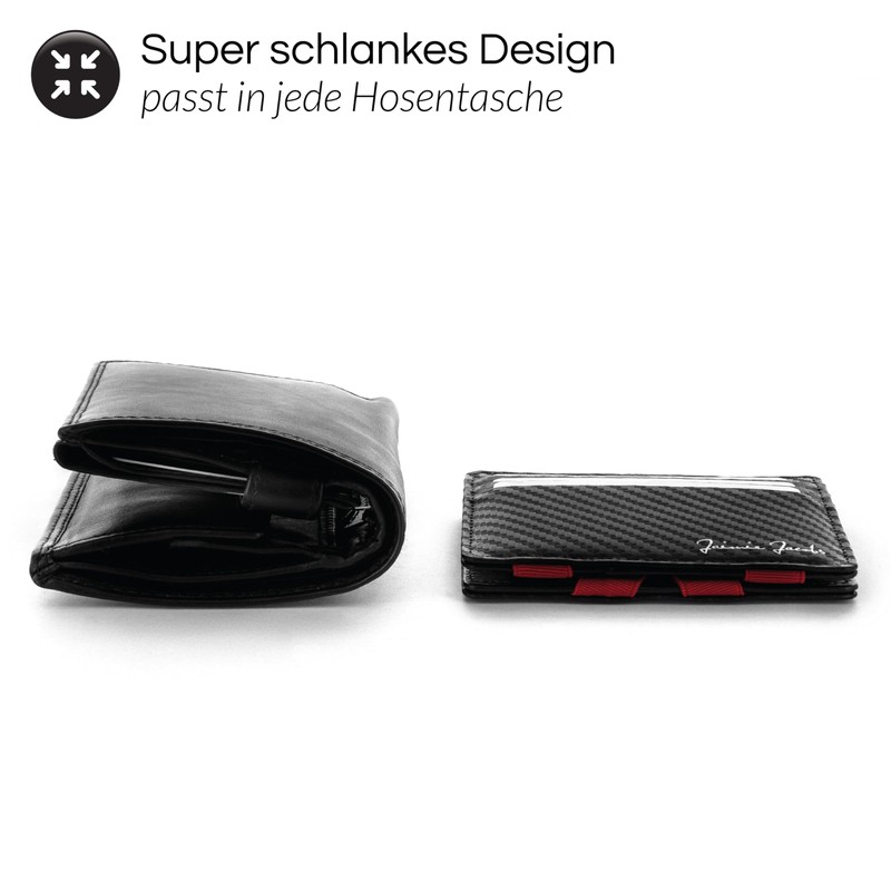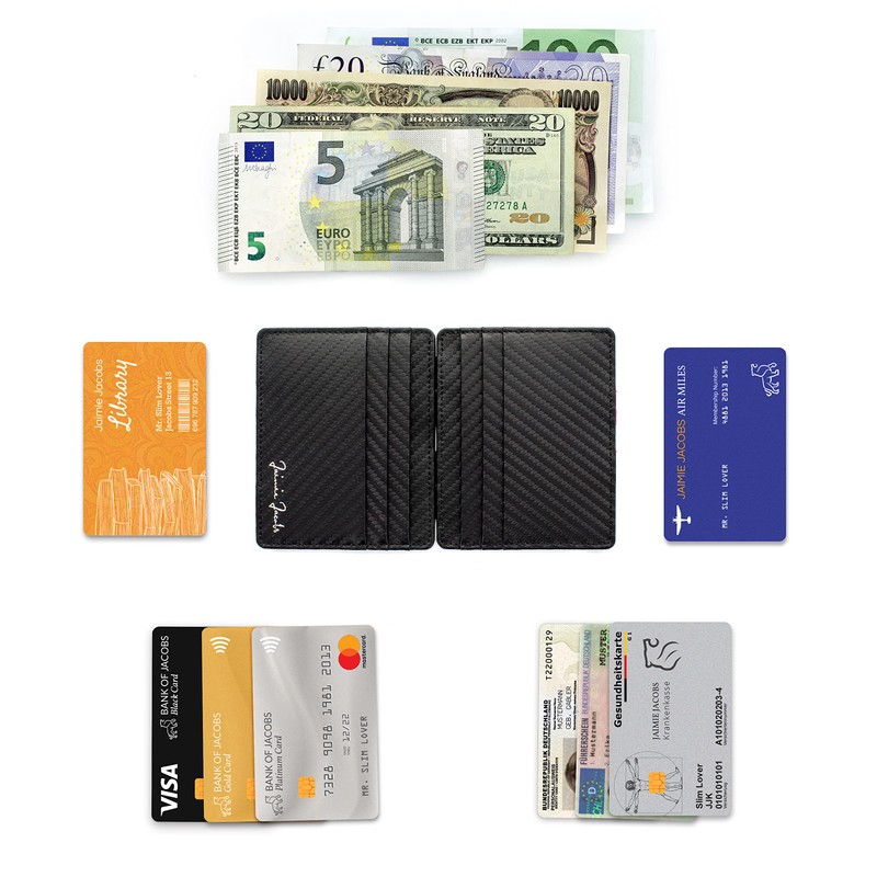 - Magic trick: Our magic wallet is equipped with the innovative magic flap function. You simply place your banknotes loosely on the inside of the magic wallet and close it. When reopening the credit card holder, the banknotes are magically stowed behind the elastic bands. A highlight that will impress your friends too. This refined trick makes the Magic Wallet a favourite piece for style-conscious men.