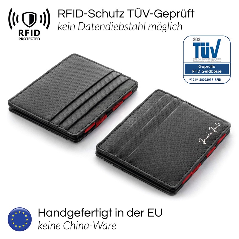 - RFID protection: The protection technology is incorporated into the front and back of the wallet and protects all your cards from data theft. RFID enables data from newer passports, identity cards or credit cards to be read contactlessly. Our RFID protection is TÜV tested and protects your cards from undetected reading.