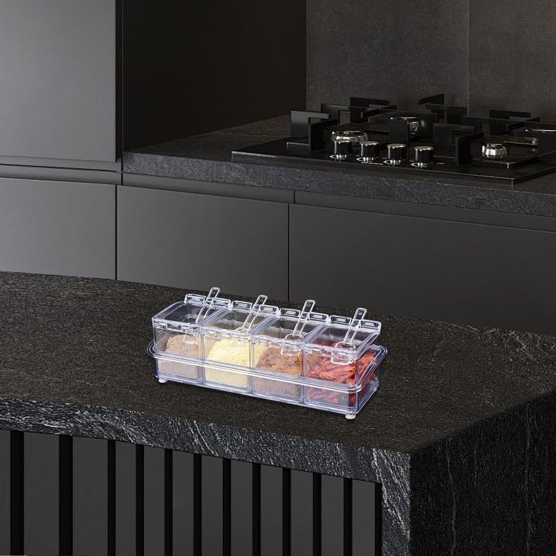 JAKOUE 4 Pieces Clear Seasoning Box spice-racks with Lids and Spoon, Storage Container Condiment Jars Acrylic Seasoning Box,Kitchen Organization Containers for Spice, Salt, Sugar, Cruet