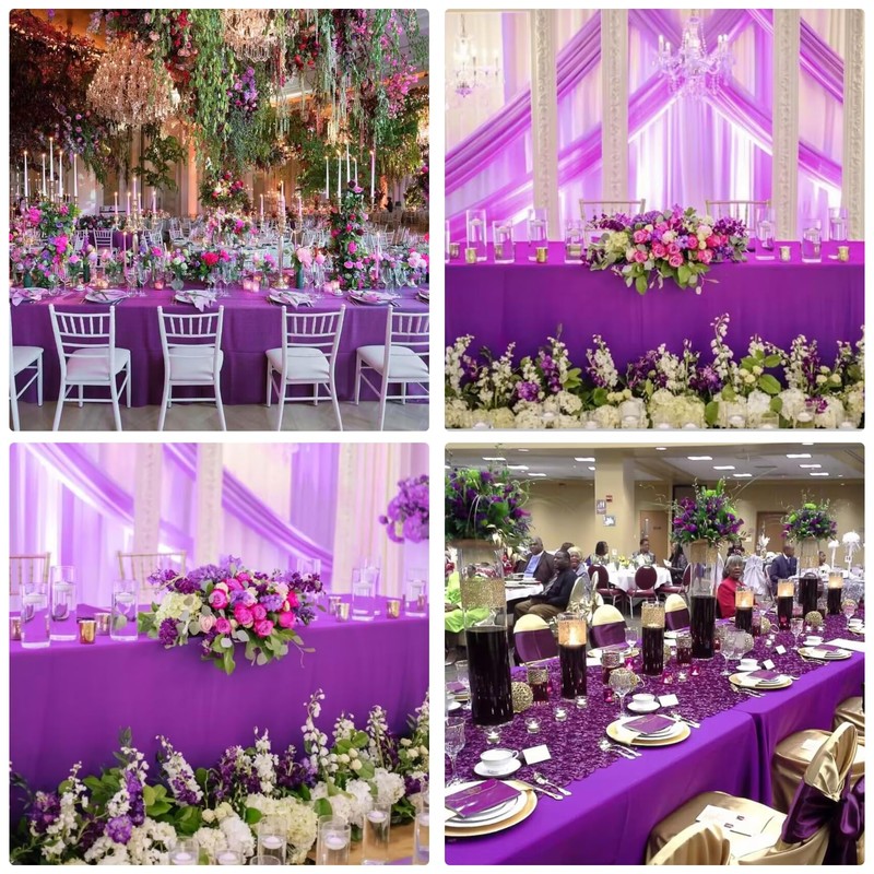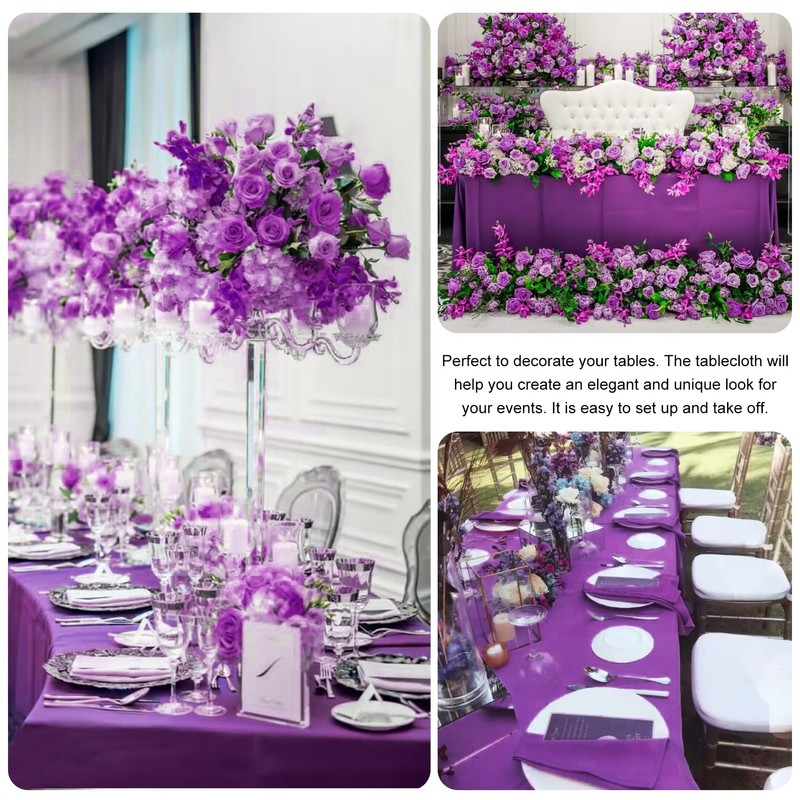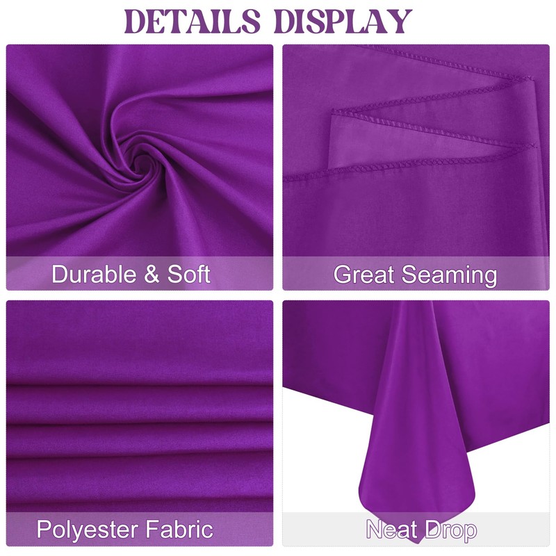 - 【PACKAGE INCLUDED】The package will include 4 packs of purple 100% premium polyester tablecloths. This size of each tablecloth is approximately 60” wide x102” long, perfect for standard 6ft table, providing 15 inch drop. Please carefully measure your table size before purchasing our tablecloth, Thank you so much!