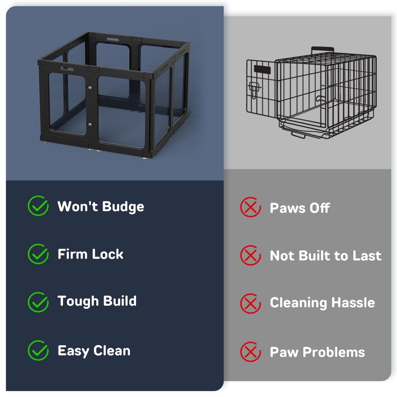 - đ¶ăModern DesignăDiscover the indoor dog playpen, merging modern design with pet comfort. Our clear dog playpen features transparent panels, offering a stress-free, open space for pets. Easily monitor your pets' happiness and safety with this innovative, transparent plastic small dog playpen for dogs. Enjoy the sleek design that keeps your pets secure and visible in your home.