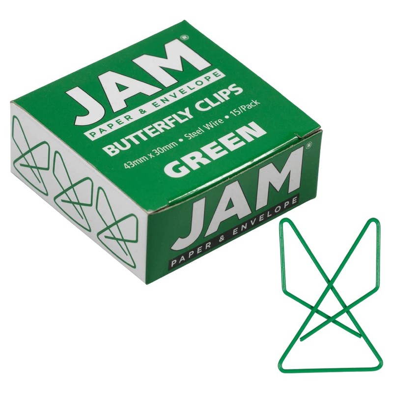 JAM Paper Butterfly Paper Clips are a unique twist on the boring old paper clip. These cool clips are used the same way you would a regular paper clip, but they make a bolder statement and add a little fun to your office or school work. Want to stand out? Try out these butterfly clips and start getting noticed! These green clips are made of durable metal, so you can feel confident that your papers are always secure. They measure 1.5 inches and have a 100 sheet capacity. Sold in packs of 15. Size: 1.5 inches (38.1 mm) | Color: Green | Quantity: 15/Pack