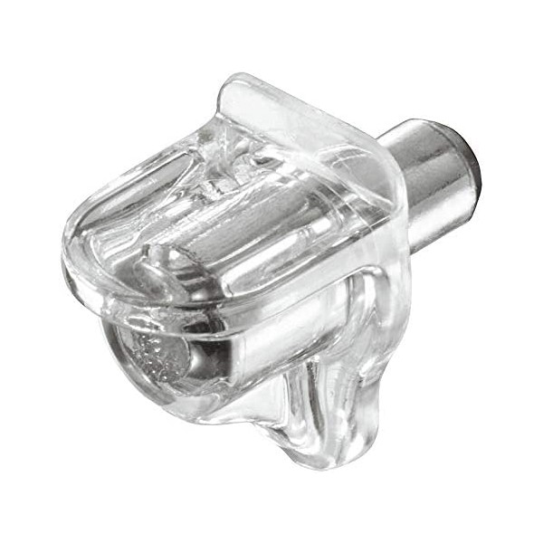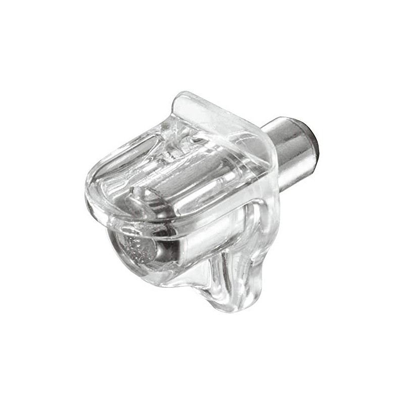 - A sturdy shelf support for standard 5mm holes featuring a galvanized steel pin and a tough, durable transparent support.