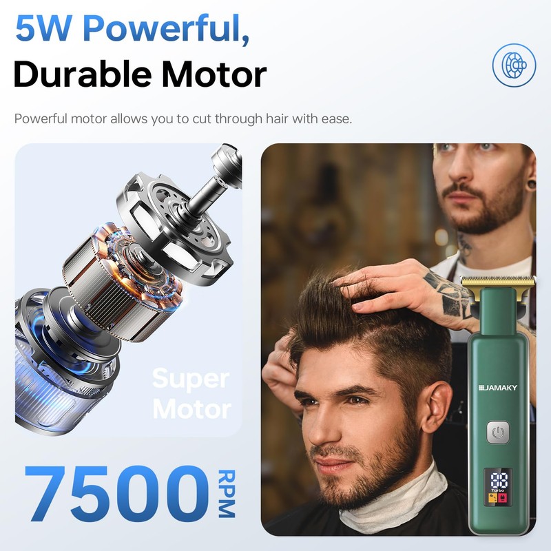 - Enhanced Precision with JAMAKY T-Blade - Experience ultimate grooming with JAMAKY Cordless Hair Clippers for Men. Engineered for precision, our advanced LED display T-blade trimmer is perfect for achieving zero gapped, detailed outlines and stylish haircuts. With a 7500RPM electric motor, it's a top pick for both professional barbers and home use.