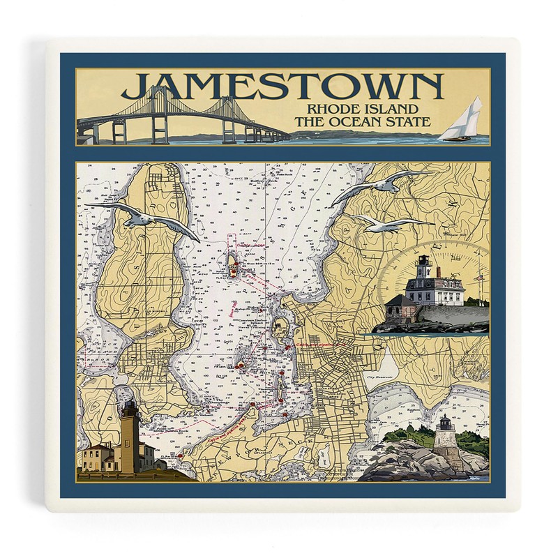 - Jamestown, Rhode Island, Nautical Chart (Absorbent Ceramic Coaster, Single, Cork Back, Kitchen Table Decor), each coaster measures 4x4 inches.