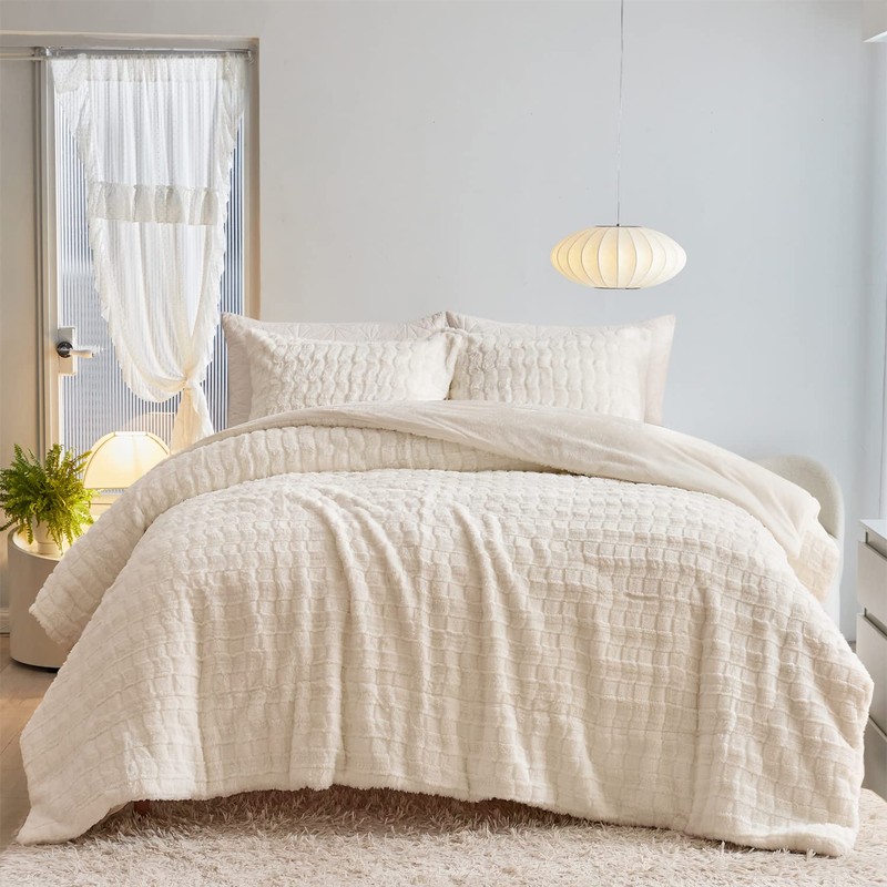 Jameswish Faux Rabbit Fur Duvet Cover Set Super Soft Furry Comforter Cover Set Luxury Cozy Cross Pattern Plush Fuzzy Fluffy 3Pcs Bedding Set(1Duvet Cover+2 Pillowcases) (Queen Size, Ivory White)