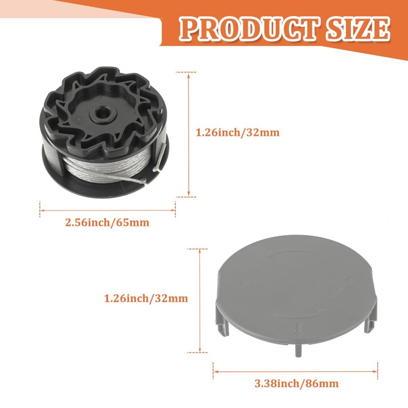 - Packliste: 6 x F016800570 Ersatz Trimmerspule, 2 x 1600A01R5J Trimmerabdeckung. Vollautomatische Einzelfadenspule 6 Meter, 1,6 mm Fadendurchmesser