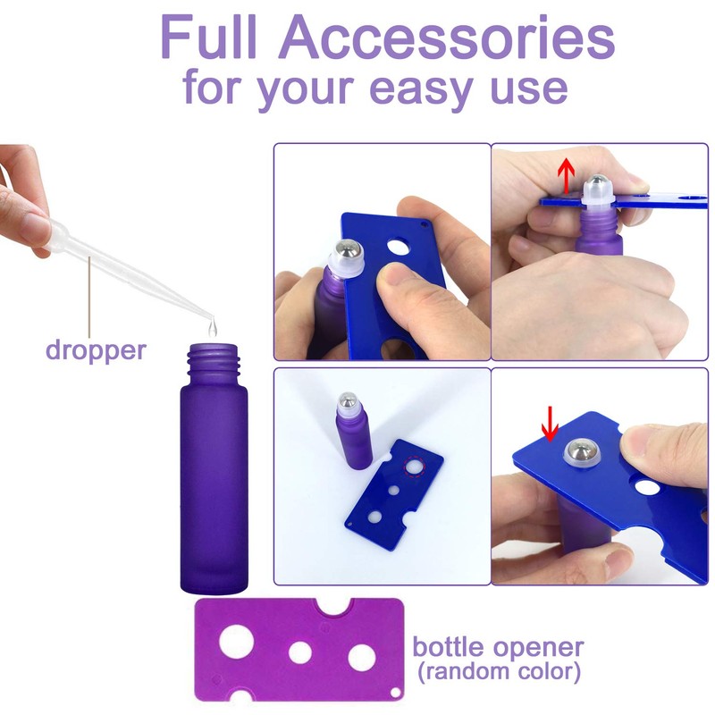 - Fácil de usar: botellas de rodillo de aceite esencial suaves para una fácil aplicación uniforme de aceite y evitar que el aceite se caiga. Una herramienta de palanca de abridor de tapa de regalo, te permite rellenar la botella más fácilmente. Pero ten en cuenta que la "herramienta de palanca para abrir tapas" se utiliza para quitar el cuello de plástico de la botella, no la bola rodante.