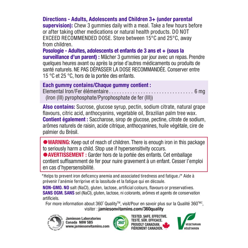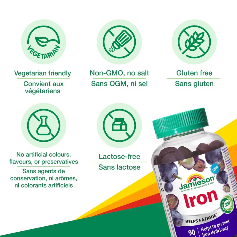 Jamieson Iron Gummies Grape Flavour 90 Count, Helps to Prevent Iron Deficiency