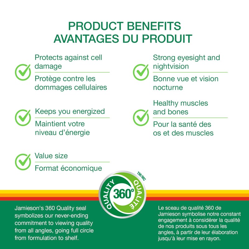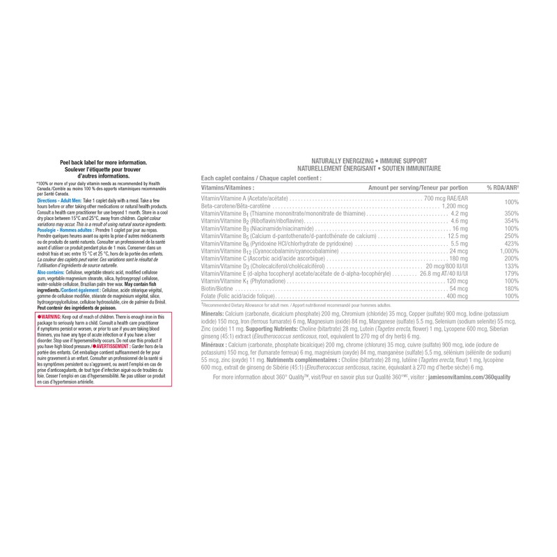 Jamieson 100% Complete Multivitamin for Men is the easy way to get 100% of your body's daily vitamin needs. It is formulated to Health Canada's recommendations so you can feel confident you are getting 100% or more of the vitamins your body needs each day!