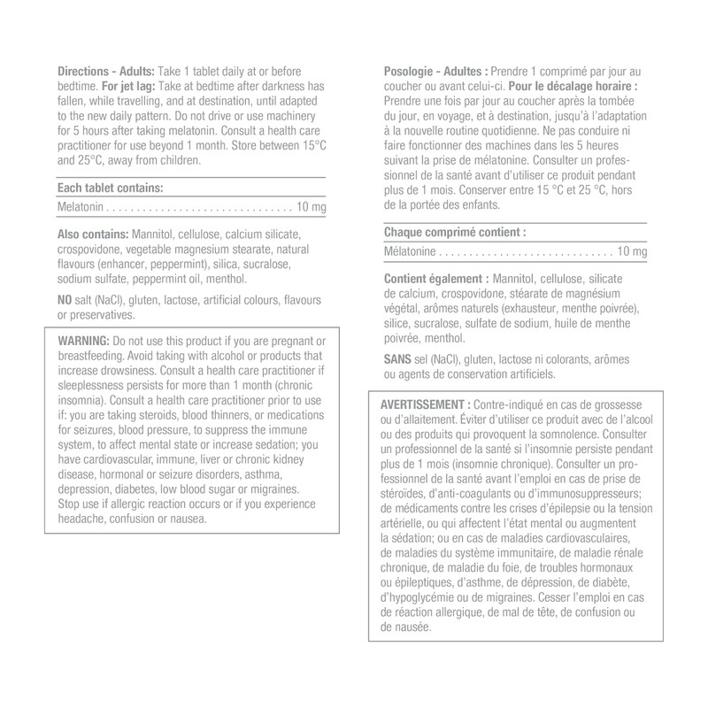 Jamieson Melatonin 10 mg Fast Dissolving Tablets help you return to optimal sleep patterns and combat jet lag. The active ingredients are absorbed quickly for maximum effectiveness.