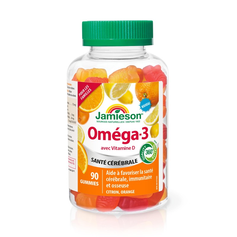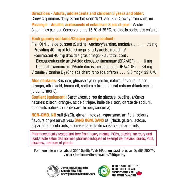 Jamieson Omega-3 Gummies are a family-friendly formula providing premium EPA and DHA plus Vitamin D3 in all-natural orange, lemon & mixed berry flavor gummies. The family-friendly formula is for adults, adolescents, and children 3 years and older. Jamieson Omega-3 Gummies are free from artificial flavors, colors, or preservatives.