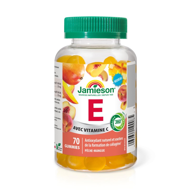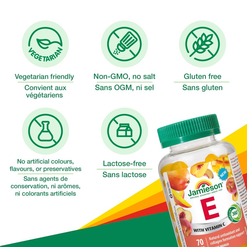 Jamieson Vitamin E Gummies Peach Mango Flavour 70 Count, Natural Antioxidant & Collagen Formation Support