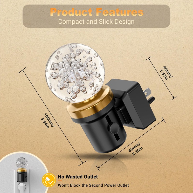 - Modern and Stylish Night Light: This plug-in globular bubble night light features a sleek, wall sconce-inspired design with a Metal electroplated gold ring, adding a contemporary and sophisticated touch. The spherical night light emits a charming light makes it a perfect lighting solution for bedrooms, living rooms, and hallways.