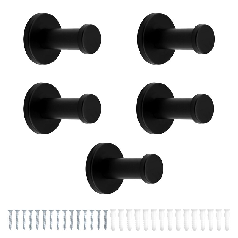 JANDH Towel Hooks, Black, Pack of 5 Coat Hooks, Matt Black, 53 mm, Towel Hooks for Drilling, Bathroom Hooks with Screws and Expansion Tube, Suitable for Kitchen, Bathroom and Bedroom