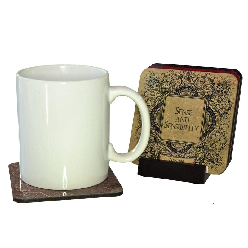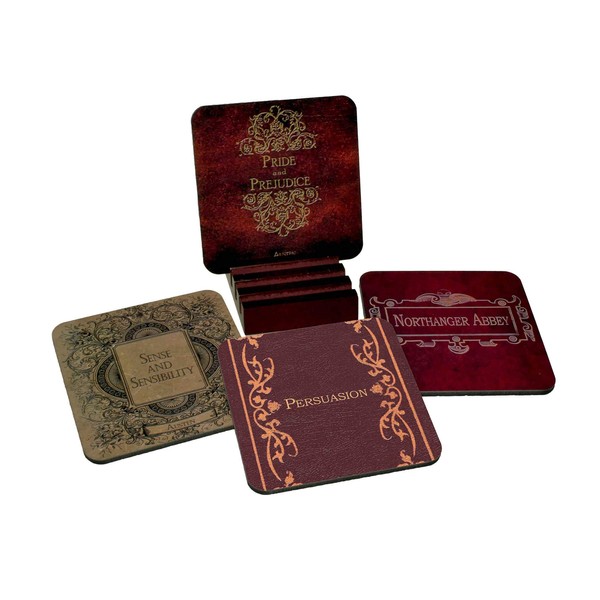 Jane Austen Novels Coaster Set - Cork Back Coasters (Set of 4, Holder Included)