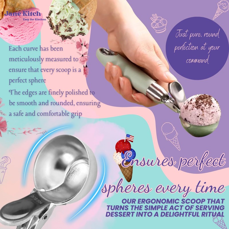- 🌸[MULTIFUNCTIONS]: Our ice cream scoop designed not only for serving up your favorite frozen treats but also as a cookie dough scoop for perfectly shaped dough balls. It excels as a cupcake scoop, ensuring consistent batter distribution, and further impresses as a cupcake scoop batter dispenser for professional baking results. Plus, it's a reliable meatball scoop, making it a must-have in your kitchen for all your culinary endeavors