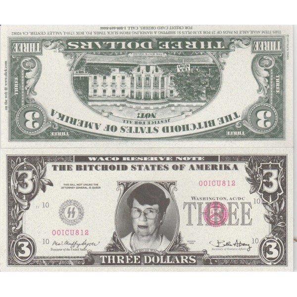 Janet Reno Three Dollars Novelty Bill Slick Times Funny-Money 1996 New