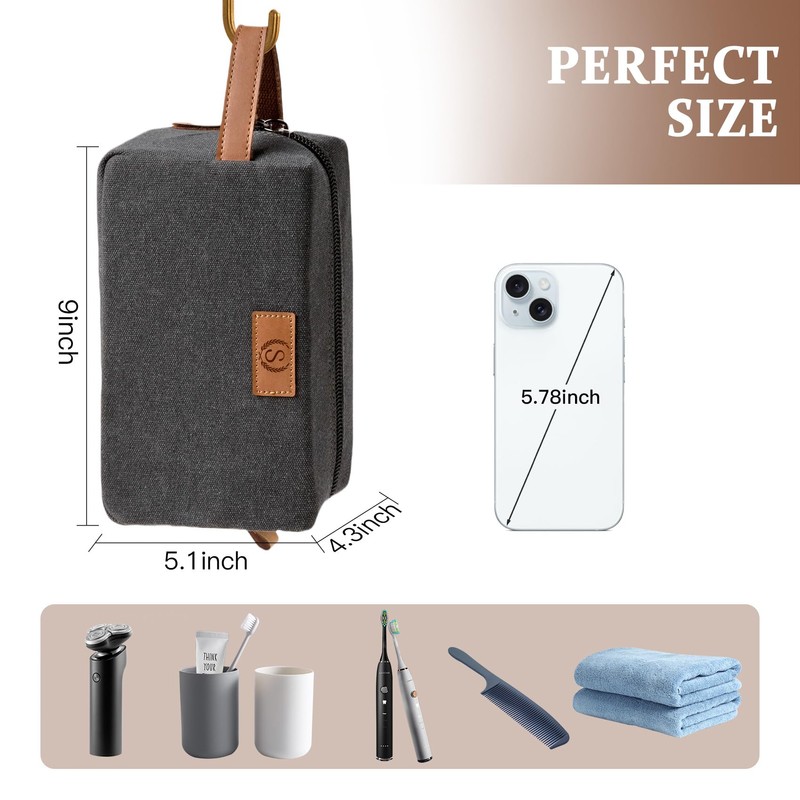 Waterproof & Large Capacity:The personalized travel size toiletries bag is handmade of canvas that offers comfortable texture with super water-resistance. Multiple areas of makeup organizer will be perfecrt for storing more items. SIZE: 9” (Length) x5.1” (Height) x 4.7” (Width). Weight: 0.35 LB. Large capacity toiletry box for traveling can hold all your grooming, shaving and toiletry necessities, yet compact enough to easily pack in your travel bag.