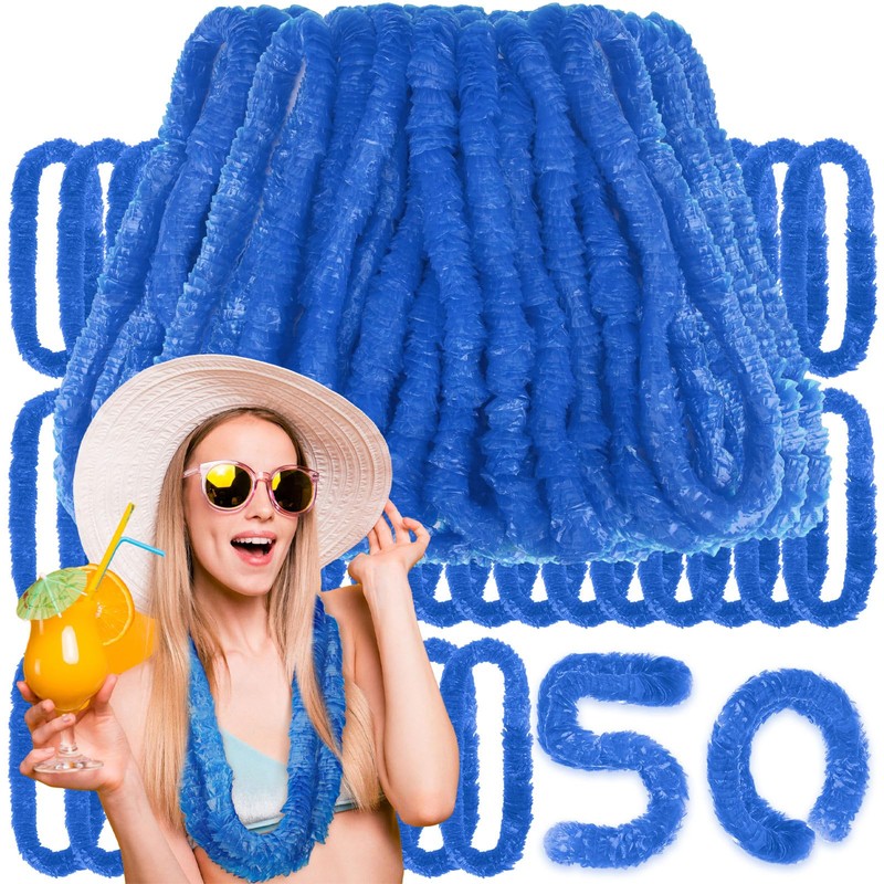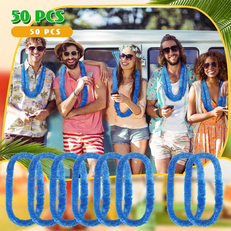 - Enough Quantity: this set packs 50 bright hawaiian blue leis; Each lei has 1.5 - inch - diameter flowers and a 36 - inch total length; No assembly is needed, just open and distribute or decorate; Ideal for large parties, celebrations, or bulk gifting, it offers an affordable way to bring tropical fun to your event, ensuring a festive vibe without overspending