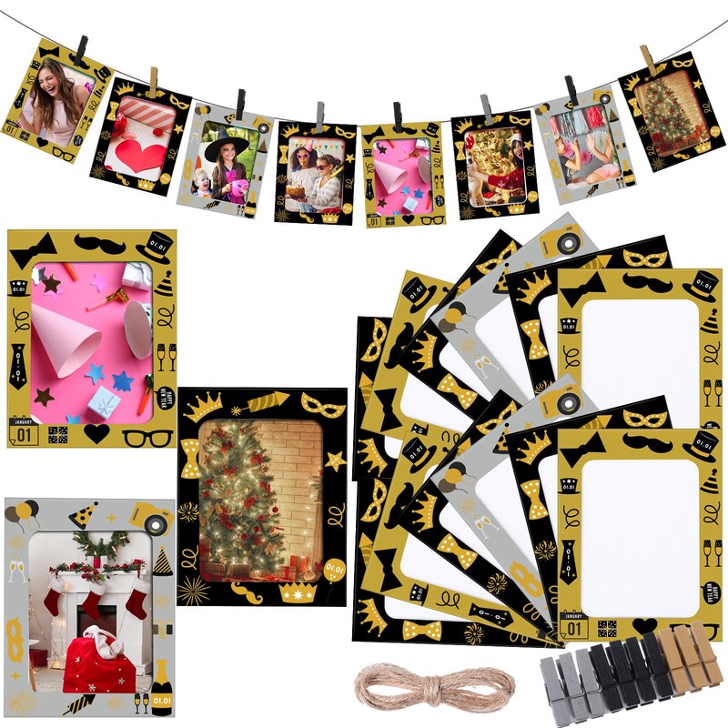 Janlaugh 100 Pcs Happy New Year Paper Picture Frames 4 x 6 2025 New Year Paper Photo Frame with 100 Clips 10 Strings Kit DIY Hanging Cardboard Photo Holder for New Year Party Wedding Photo Display