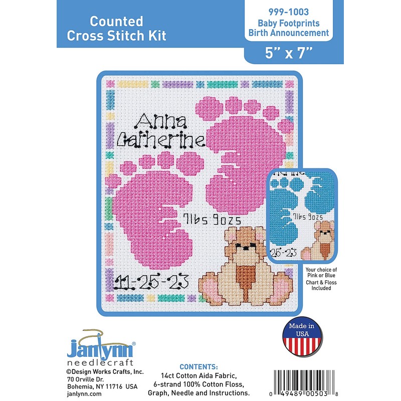 Janlynn Baby Footprints Counted Cross Stitch Kit, Pink, Purple, White