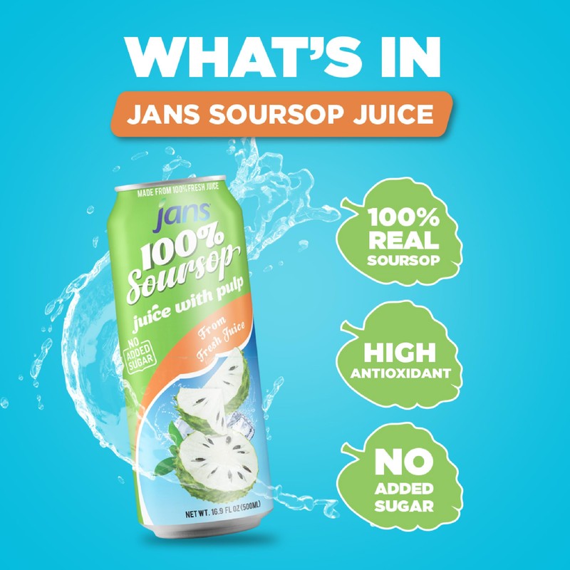 - SOUR SOP DRINK FOR A HEALTHY LIFESTYLE - Low calorie content and natural ingredients, JANS Soursoup Juice makes for a guilt-free beverage choice for healthy lifestyle. Best paired with JANS Soursop Tea Bags made from Soursop Leaves.