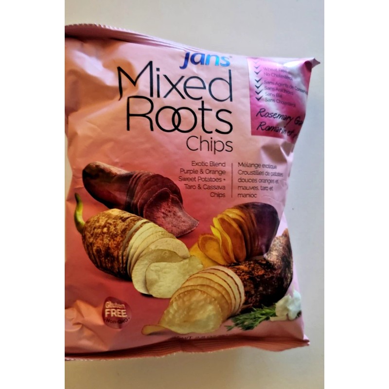 - Jans Mixed Roots Chips with Salt & Vinegar is a healthier snack compared to ordinary potato chips. It has a unique, zesty and delicious taste. Made with a mix of Sweet Potatoes, Cassava, Taro, and finished off with a pinch of Salt & Vinegar.
