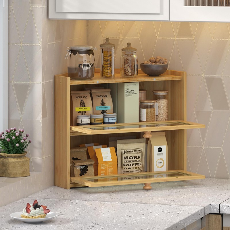 - 【LARGE CAPACITY CORNER BREAD BOX 】The spacious interior of this double layer corner bread container can be used not only to hold bread and other baked goods, but also to store fruits, spices, coffee, tea, bowls and other kitchen utensils.