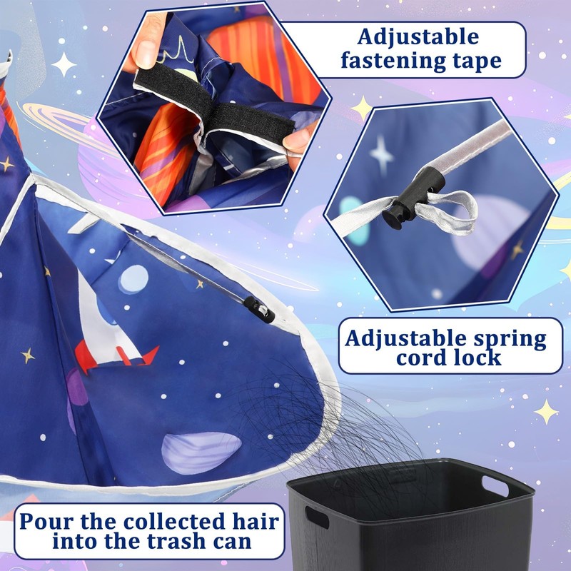 • Umbrella-Shaped Deep Groove Design: The deep groove adopt a unique umbrella-shaped deep groove design, which can effectively avoid hair from falling to clothes or the floor, making cleaning easier and faster. The bright and lively space theme pattern on the kids barber cape not only makes children feel happy, but also makes them more comfortable when they have a haircut