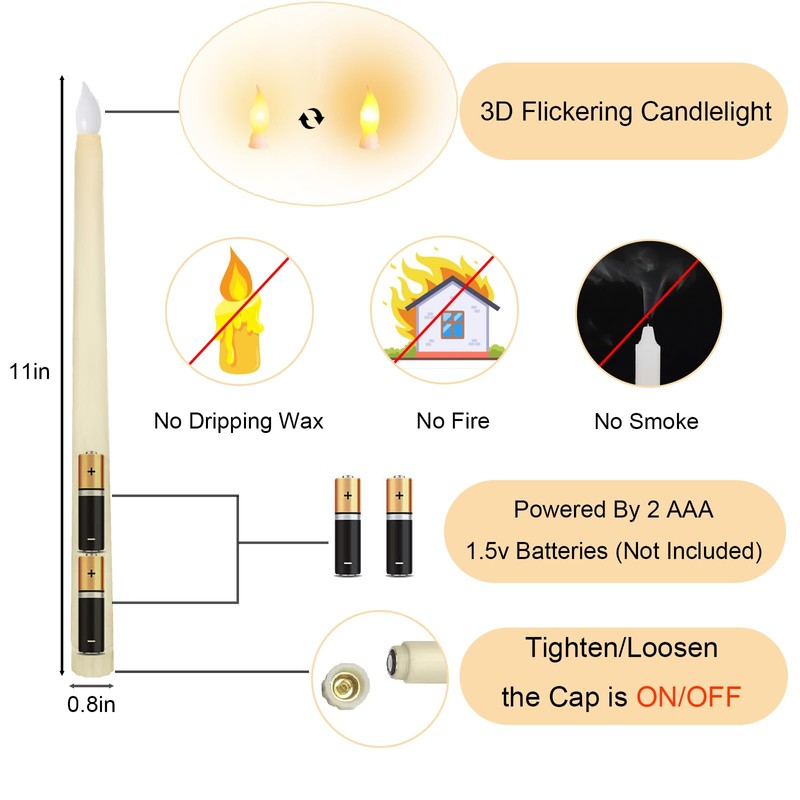 - 【Easy To Turn On/Off】: Jaoruizer LED tapper candles require 2 AAA batteries (not included in the packaging), which can be controlled by turning the knob switch on the bottom cover. When tightened, it opens, and when loosened, it closes.