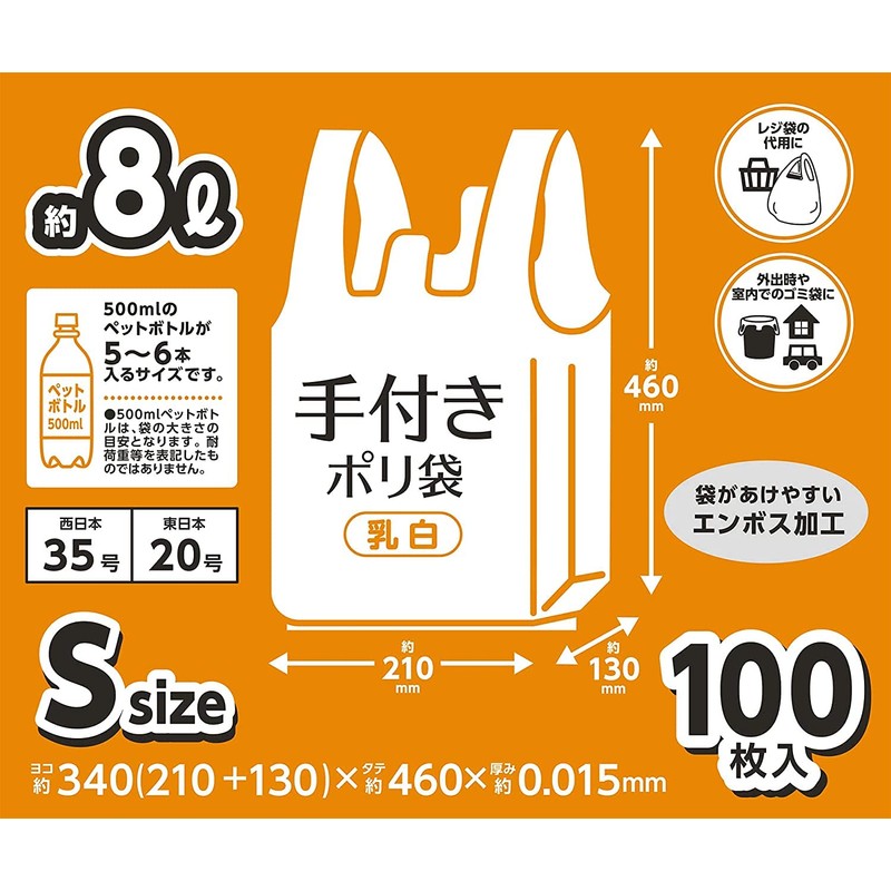Japack’s PRH27W Milky White Poly Bags with Handles, Approx 2.1 gal (8L), (W x L x Gusset): 8.3 x 18.1 x 5.1 inches (21 x 46 x 13cm), Thickness: 0.0006 inches (0.015mm), Easy to Open, Embossed, Large Capacity Trash Bags, 100 Bags x 2 Packs