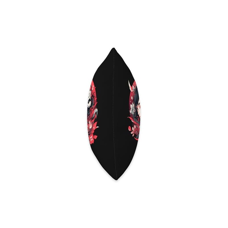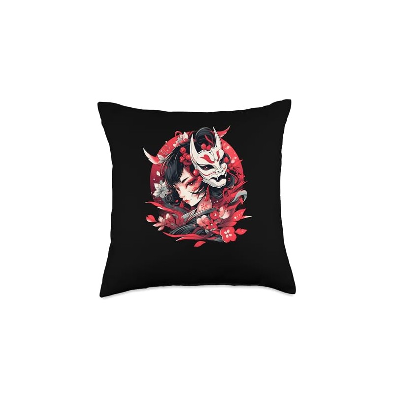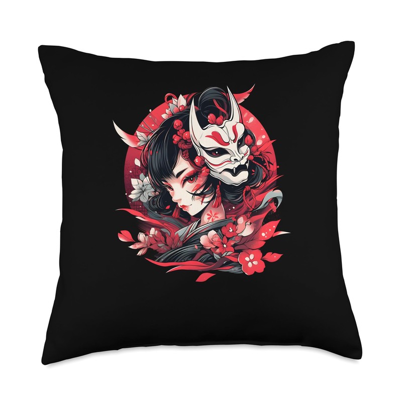 Japanese Anime Mask Floral Culture Illustration Throw Pillow
