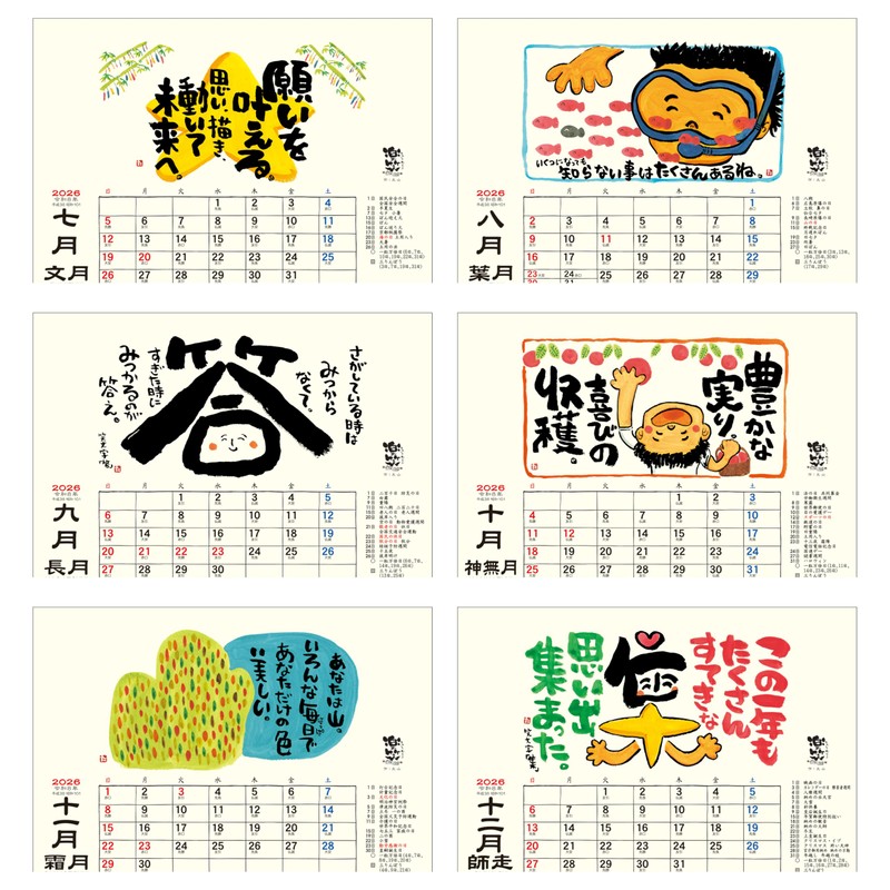 Japanese Calendar 2026 - "Rakusho" uplifting Illustrations with calligraphy by Taisan, 7" x 6" Monthly Desk Flip, Made in Japan Todan TD-30268