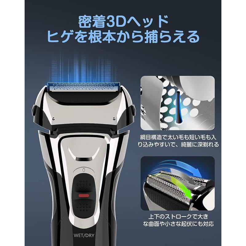 [Titanium Mesh 3-Blade] Men's shaver has an independent floating 3-blade head that reduces the burden on your skin and shaves efficiently by automatically adhering to the curved surfaces and small undulations of the contours of your face, neck, and jaw. Cut. It provides a close shave from the roots and captures beards that grow in various directions.