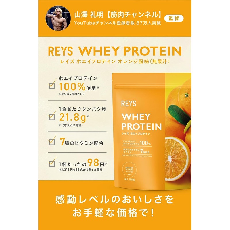 [Japanese Sports Supplements] REYS Whey Protein Supervised by Reiaki Yamazawa 1kg Domestic production Contains 7 types of vitamins WPC protein Grape flavor orange flavor