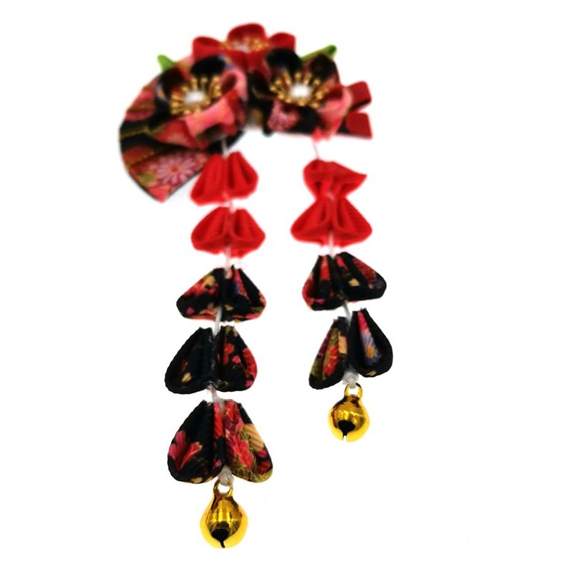 Japanese Style Women Flower Hair Clip Tassel Hair Ornament, Kimono Decor Fabric Hanfu Hairpin Accessories For Christmas Party Costume Gift (Black)